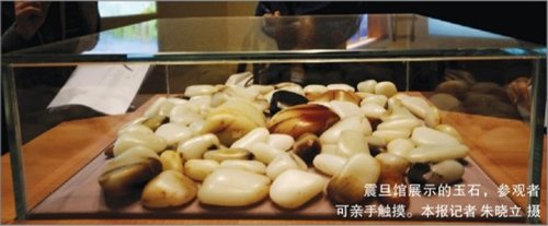 在震旦馆核心展区,参观者可看到白玉、青玉、墨玉、翡翠等8 种玉石。顾益生表示,大部分陈列橱窗都设置有触摸孔,参观者可触摸价值七千万元的和田玉籽料等。