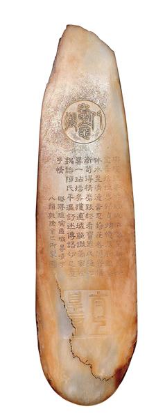 我国历史上各个时期都有玉器生产,留下了众多的玉器珍品,其中玉戈即是颇具特色的一个品类。如在2009年11月香港匡时日本亲和联合拍卖会上,曾有一件清代乾隆皇帝御题诗并阳刻用印的古玉戈(图二),上面刻诗90字,其中“苟得精磨致,终看宝器成。隐之略一玷,扬矣获连城”之句,赋予了玉戈卓尔不凡的品位,为古玉戈增添了亮丽的色彩。