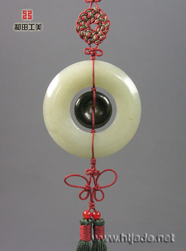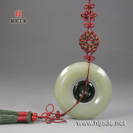 和田玉青白玉乾坤圈。以新疆和田玉青白玉为材,带微糖,局部略有微花,无碍。色呈青白,出自和田密尔岱矿,润度好,细腻,手感佳。此料设计成乾坤圈式样,中间配以墨玉平安扣,很有东方传统古朴的味道。作汽车挂饰或居家的墙挂,增添一份吉祥、平安和喜庆。 产品图一: 产品图二: 产品图三: