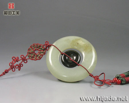和田玉青白玉乾坤圈。以新疆和田玉青白玉为材,带微糖,局部略有微花,无碍。色呈青白,出自和田密尔岱矿,润度好,细腻,手感佳。此料设计成乾坤圈式样,中间配以墨玉平安扣,很有东方传统古朴的味道。作汽车挂饰或居家的墙挂,增添一份吉祥、平安和喜庆。