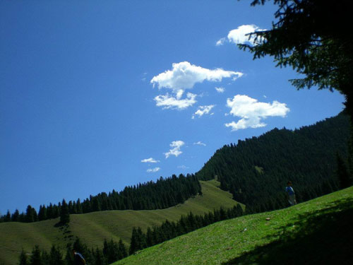 白天,躺在这个天然的牧场上,把心也放了羊,什么都可以想,什么也可以不想,眯眼轻睡,不时沙沙的风声传过来,风儿带着新鲜潮湿的空气,扑打着脸庞,开眼望天,满眼的蓝啊,那么清澈,几朵白云象海水卷起的浪花,轻薄纱似,怎一个美字了得!