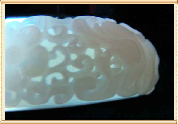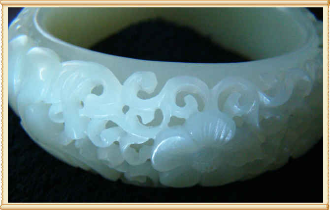 新人报道,发个小物件。亲戚的收藏,和田玉青白山料,因为特别喜欢镂空,专门订做了几只这样的镯子。这只是宽边的,边宽22MM,圈口57.5,工好,料好。图是实物的照片。