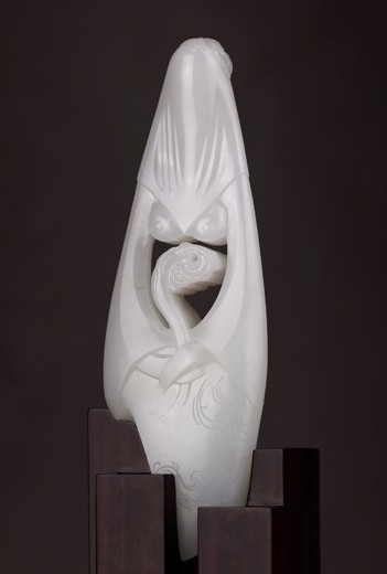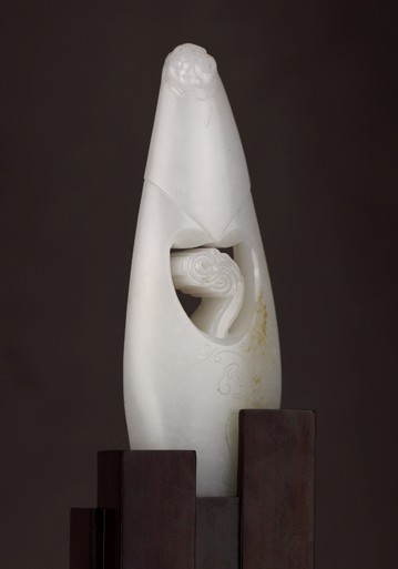 现代版的古典新娘造型,头披红盖,身穿裙褂,正襟端坐,虽然盖头掩面,却仿佛依稀可见脸上娇羞含笑的表情,新娘身体部位与众不同的心形镂空设计可谓匠心独运,双手所持的如意填满心房,象征着她对这门美好姻缘满心如意。裸露的胸部设计虽略显夸张,却也为这件作品增添了些许时尚气息。头上的大朵牡丹以及裙摆上阴刻的纹饰则起到很好的点缀作用。而只是由几块高低不等的方木拼接的底座造型更是让这件作品从传统的藩篱中跳脱出来,成为一款不拘一格的玉雕摆件。