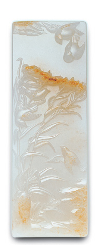 本件"清和朗潤"玉插牌,乃觀喜堂所出品,是劉忠榮先生設計、琢製的作品,2004年10月份曾在臺北觀喜堂所舉辦的"清和朗潤-----和闐子兒玉當代名家玉牌創作展"上展出過。