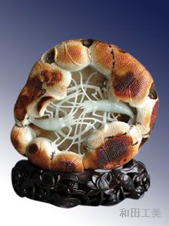 籽玉皮的形成,非历经长时间的酝酿、外力的冲击,是得不到的。此件子玉的皮子,堪称大自然的杰作,色泽非常的珍稀难得,工艺师巧用皮身,碾琢成一大片秋荷,其间从浅黄、深黄、深红、到深褐色,将秋荷描绘得一如年老花去的舞姬,仿佛犹能见到盛夏送香之情景,豪艳的影子依稀可见。子玉内裹纯美润泽的白玉,工艺师运用高难的镂空技法,掏膛琢成两只丰腴的肥虾,虾身色泽明亮,肢体相互缠绕,似在荷塘嬉戏。深秋时节,荷枯鱼肥,虾美蟹黄的景象,禁不住联想到渔家女泛舟秋塘采藕,笑声连连,一种盎然的生机扫去了残荷带来的伤感,荷塘情趣由此而横生。作品凝聚了工艺师的才华巧思,高超技艺,加之天然的形貌、色泽的美感,无疑是玉器的精品。