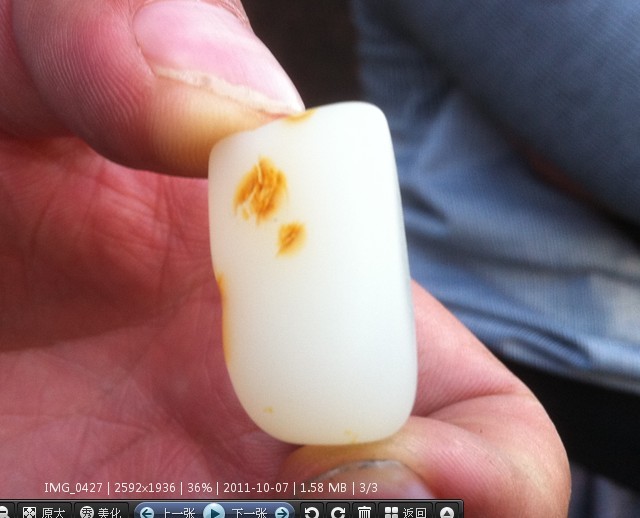 这样的白度在籽料中比较少,面的感觉不自然,润度也不好,但初看却是做的很真,上路的新手要多加小心
