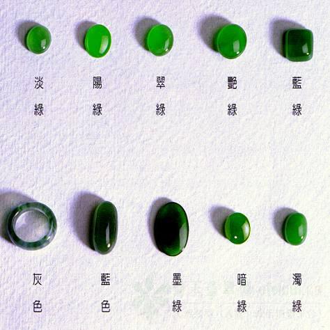 绿色品种的优劣顺序为绿色,微带灰的绿色,黄绿色,微带灰的绿色,灰绿色.