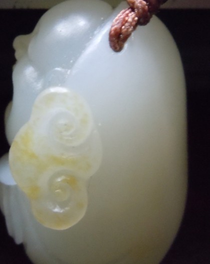 侧边如意上淡淡的黄色像是皮色,图片的清晰度不够,皮色处建议来张特写,雕工很喜庆~~~~
