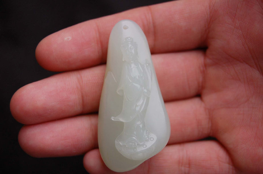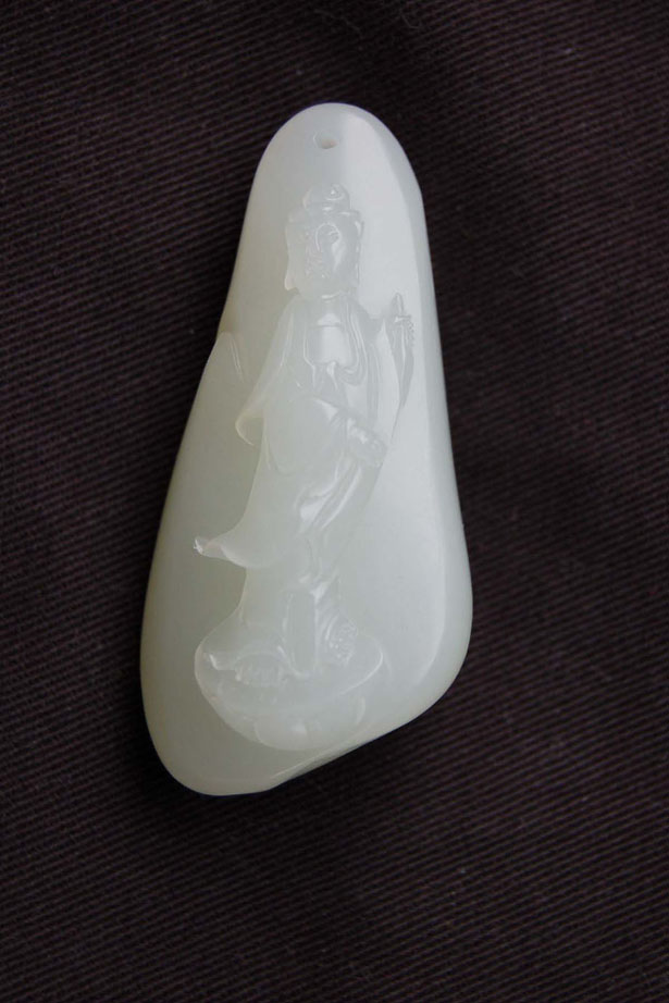 籽料观音 油性好、水头足、肉质紧、光照通透、当中无花、阁、点。55*22(最宽)*15 重36克。上海工,雕刻细腻,可从裙摆褶皱和脚指看出。自然光下拍摄,拍摄当中没有上过蜡。