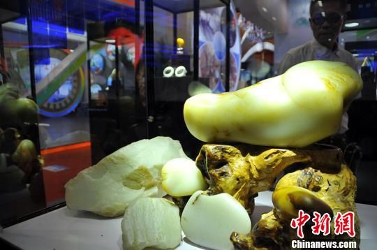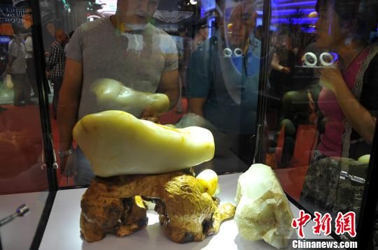 中新网乌鲁木齐9月7日电(马新龙)9月6日,记者在“中国-亚欧博览会”看到一块重达20斤的新疆和田白玉籽料在展示,温润的玉质和“大块头”引来爱好者的围观。