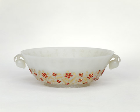 艺术作品的风格与制作者的审美取向相关,在白如凝脂的玉上错以黄金,镶嵌红色宝石,显得格外豪华富丽。本器具有典型的痕都斯坦风格,通过器物外在的华美体现出西部民族特有的热情奔放的性格特色。正因此碗具有独特的艺术神韵且仿制功力精湛,所以自乾隆五十一年(1786年)制成后始终为乾隆皇帝所珍爱,甚至在庆典活动时还被当作御殿赐茶的用具。--清宫旧藏:和阗白玉错金嵌宝石碗