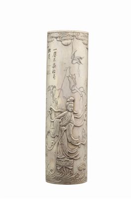 镇江博物馆收藏的这件清代牙雕观音菩萨臂搁(见图),长20厘米,宽6厘米。该臂搁形似从中剖开的竹节,面圆拱而背凹弧,上部祥云缭绕,一轮太阳半遮其中,其下一只仙鹤口衔一串佛珠,在天空盘旋,底部为波涛汹涌的海水,左右两边用阴线雕刻出竹林及岩石,中间为观音菩萨,正踏浪而来,善财童子及龙女立于两侧。